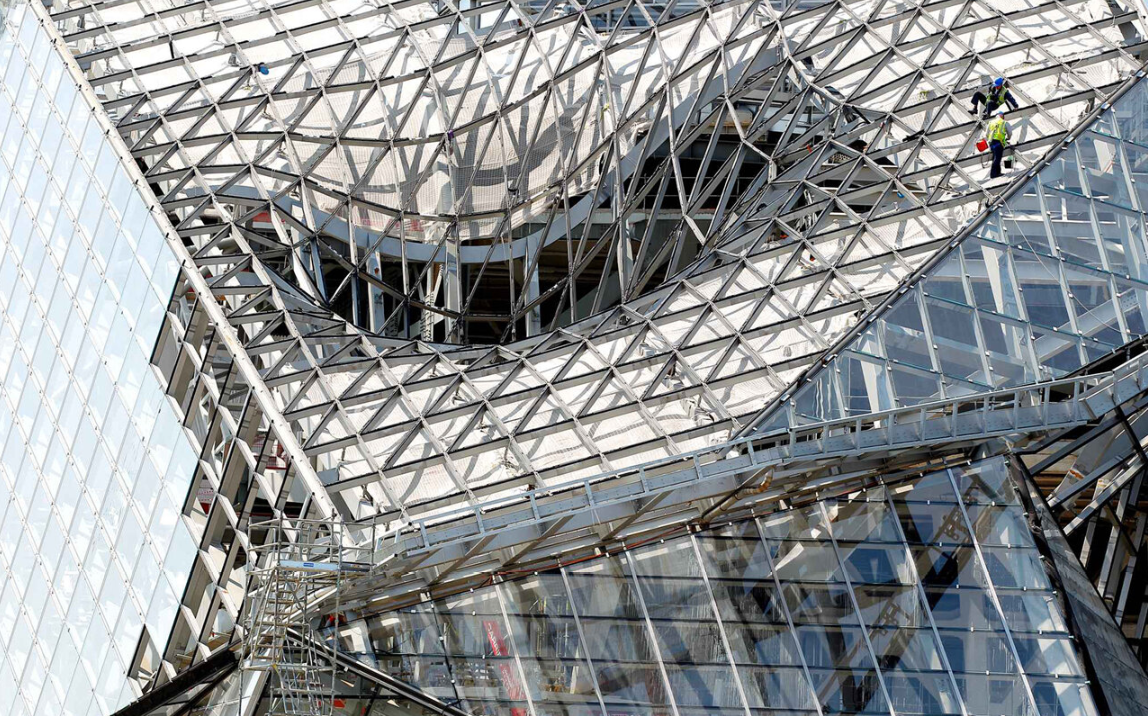 The Crystal is the first segment of the building, featuring a largely glazed monumental public reception area. The structure is fundamentally based on the design of the Cloud, necessitating a detailed study of the glazing's structural movements, primarily due to climatic loads. We conducted a verification of the parallelogram alignment to first assess the compatibility of the movements with the rabbet dimensions and, secondly, to prescribe special wedges for certain glazed units to prevent any contact with the profile fixing channels. These units are equipped with motorized openings that serve to enhance comfort as well as facilitate air supply and smoke extraction. The openings were constructed using VEC frames, which required a specific study to develop seals that ensure the tightness of these inclined frames.