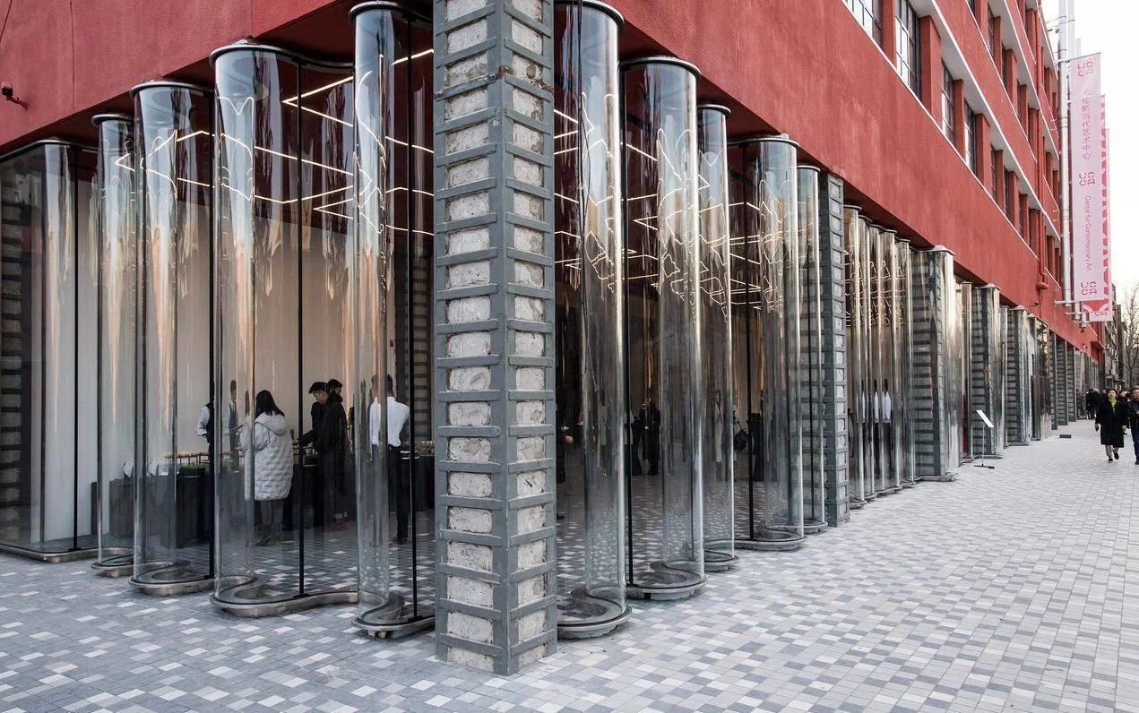 The new visual identity for UCCA in Beijing, designed by OMA, is rooted in the concept of visible transparency. We explored various ways to express this idea and ultimately selected a range of curved glass shapes. These shapes not only create captivating visual effects through the reflection of their surroundings but also highlight the subtle imperfections that occasionally emerge during the glass curving process.